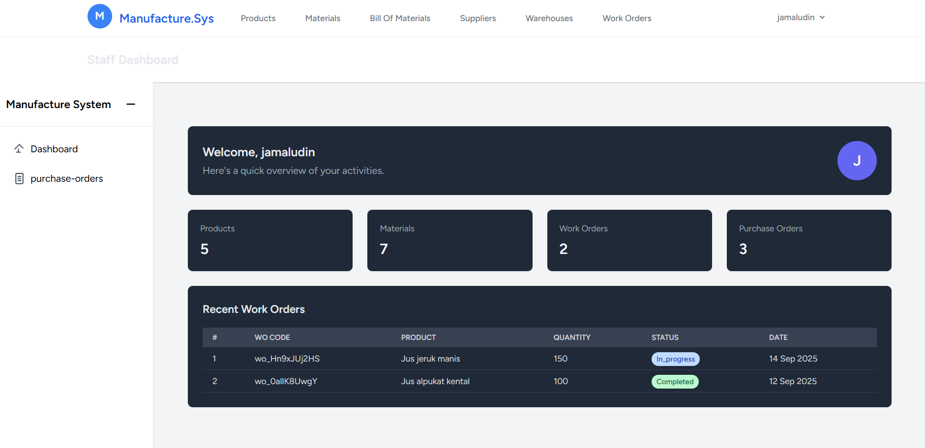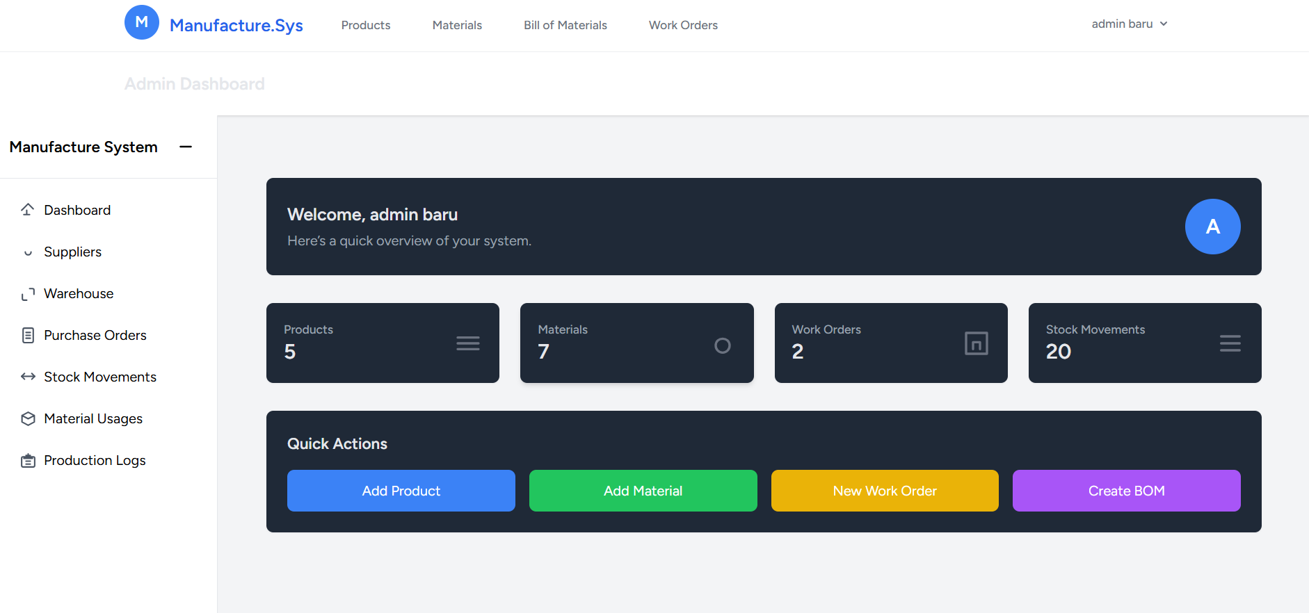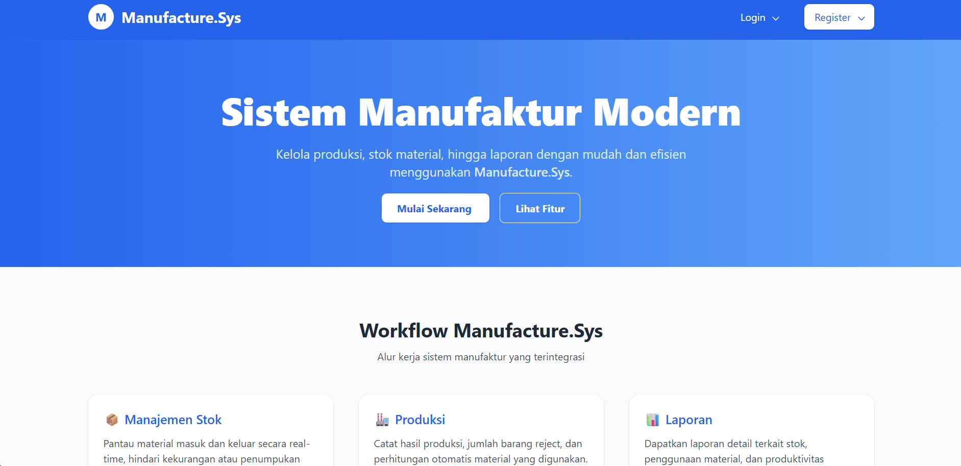 Web Application & Sistem manufaktur berbasis web yang dibuat untuk memantau proses produksi secara real-time, mulai dari pemantauan stock produk, pembuatan bill of materials, stok materials, pembuatan purchase orders, manajemen supplier. karyawan serta pelaporan kinerja karaywan. Terdapat 2 role pengguna: admin dan staff. Dimana Admin memiliki akses penuh terhadap semua fitur, sedangkan staff hanya dapat mengakses fitur yang telah ditentukan oleh admin.